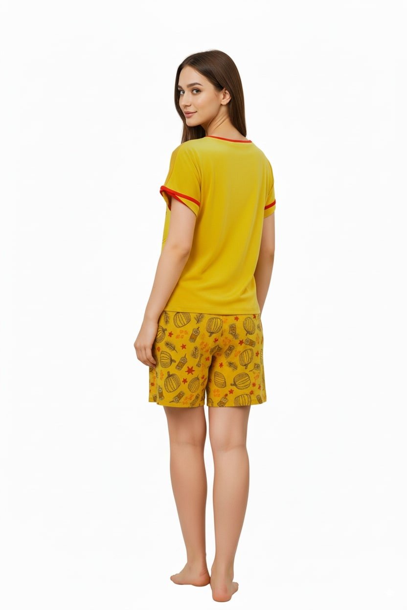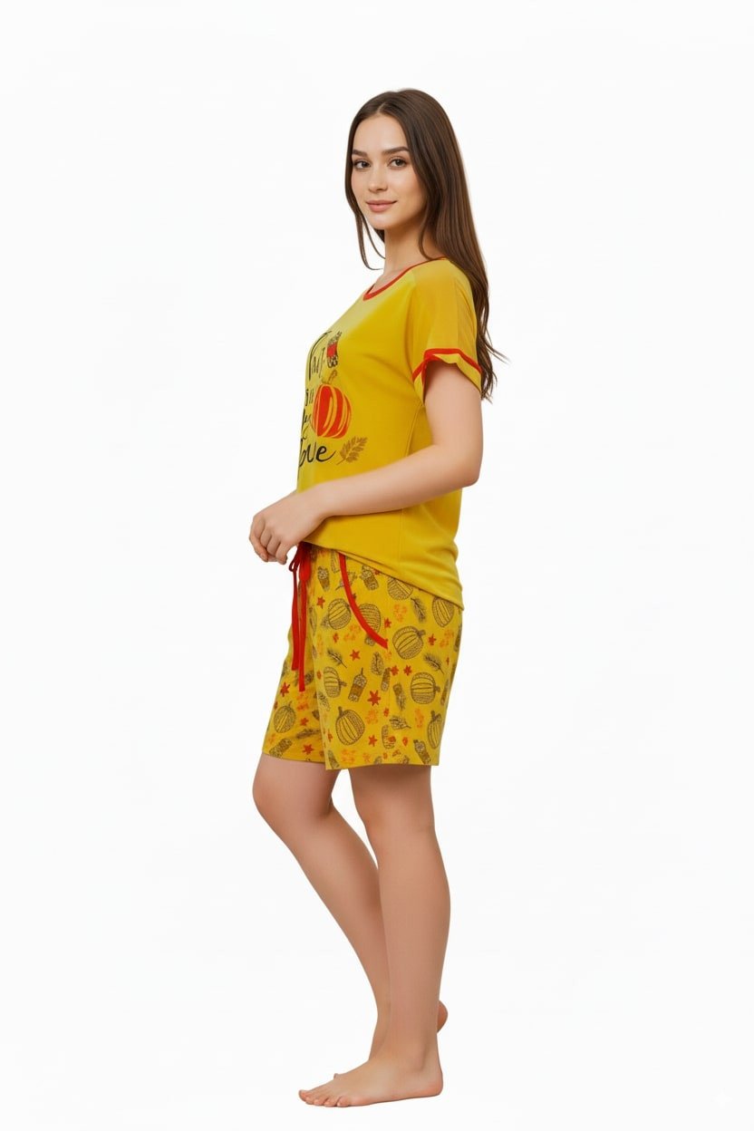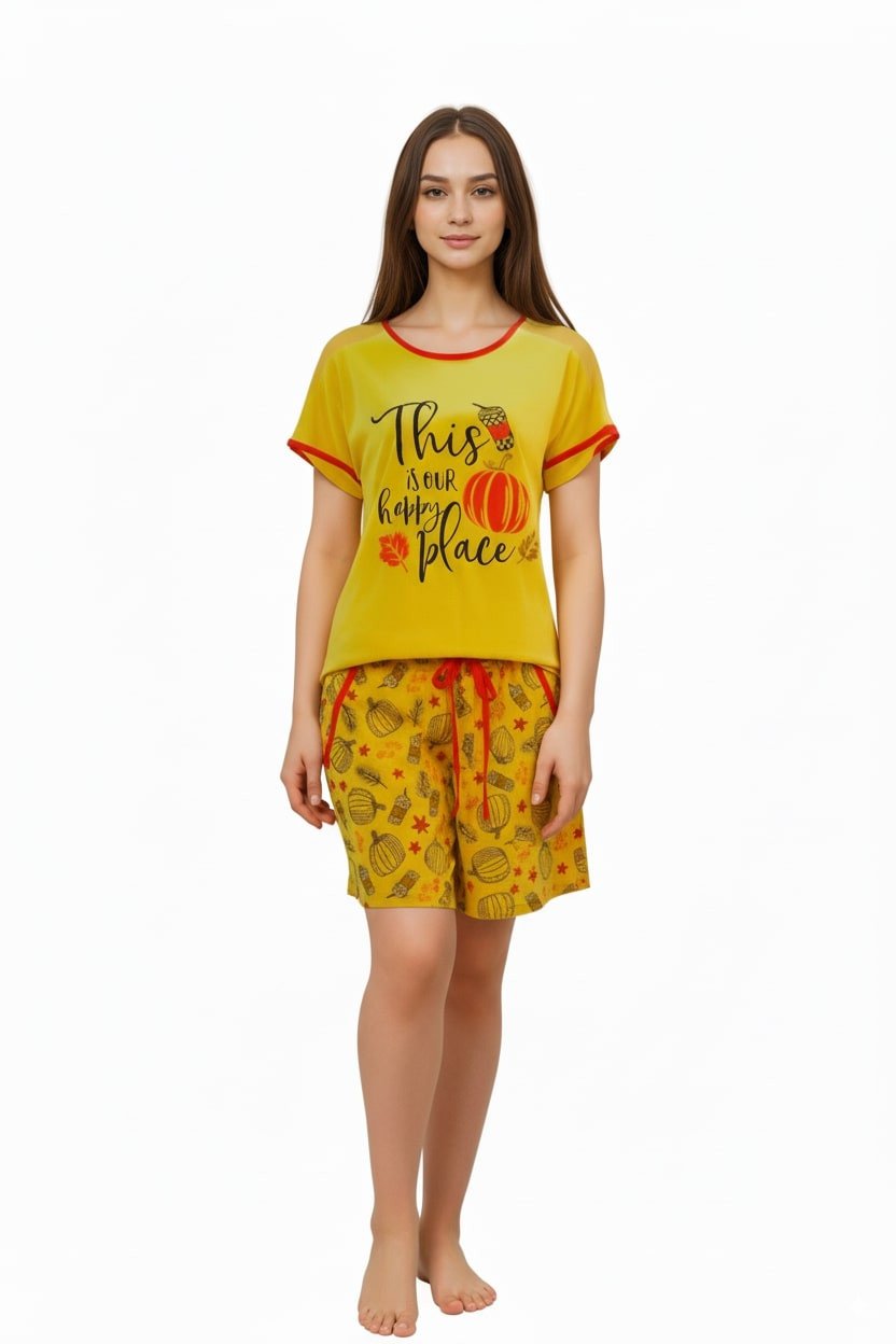 Crafted from soft, breathable cotton, this adorable set features a relaxed-fit top with playful prints and inspiring typography – “This is our happy place”. The set includes coordinating shorts with charming seasonal illustrations like pumpkins, leaves, and coffee cups, adding a touch of whimsy to your downtime. A contrasting neckline and sleeve trim, paired with an adjustable drawstring waistband, ensure a flattering fit with a cute pop of color.