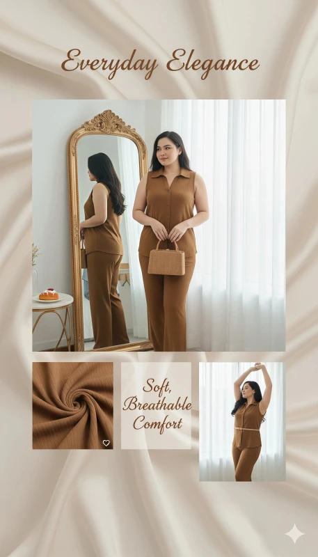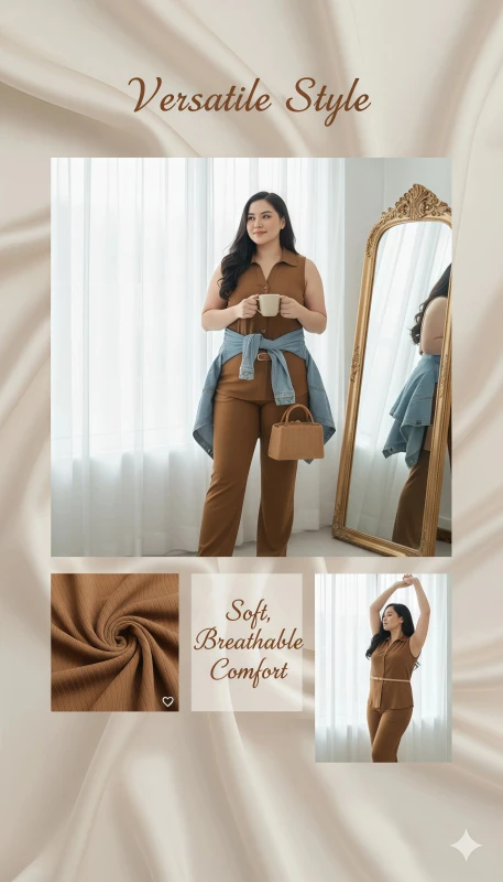 The soft, neutral beige color of this set makes it incredibly versatile, easily paired with a variety of accessories and footwear. Dress it up with heels and delicate jewelry for a sophisticated evening out, or keep it casual with sandals and a straw bag for a relaxed daytime look. Whether you're attending a brunch, heading to the office, or enjoying a leisurely weekend, this ribbed knit set promises to deliver both comfort and an effortlessly polished appearance. Its easy-care fabric ensures it remains a go-to choice in your collection, offering enduring style season after season.