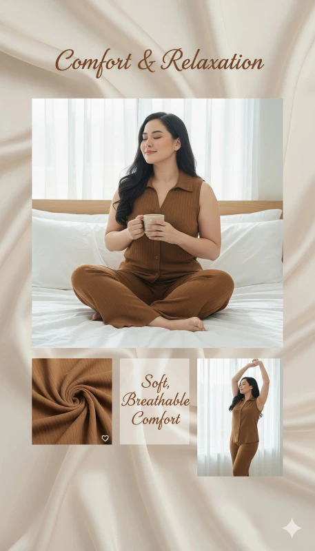 Women's Ribbed Knit Collared Sleeveless Top & Pant Set - Brown