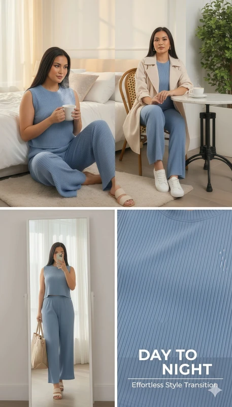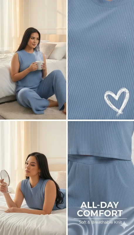 Crafted from a soft, stretchable ribbed knit fabric in a serene light blue hue, this set promises all-day comfort without compromising on style. Whether you're lounging at home, running errands, or meeting friends for a casual outing, this versatile set can be dressed up with accessories or kept simple for a relaxed vibe. Pair with your favorite sandals or sneakers for an easy, put-together look.