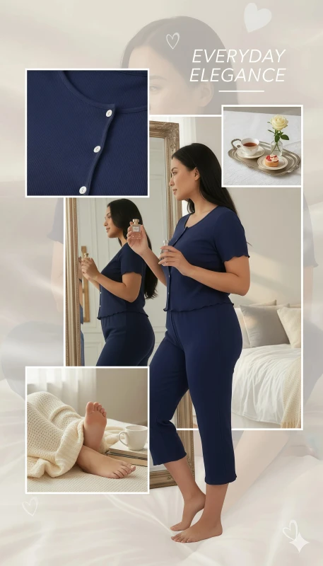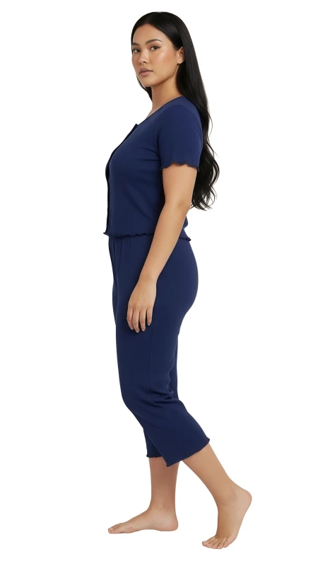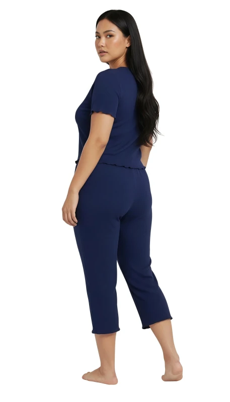 Perfect for relaxing nights and cozy mornings, this two-piece sleepwear ensemble combines a soft, breathable ribbed knit fabric with delicate design details. The short-sleeve top features a classic henley-style button placket and a sweet scalloped edge along the neckline, sleeves, and hem. The matching cropped pants continue the ribbed texture and are finished with a playful scalloped trim at the ankles, offering a relaxed fit that moves with you. Crafted in a rich navy blue, this set provides both understated elegance and luxurious comfort for your loungewear collection.