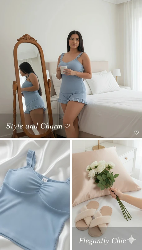 Style/Design: camisole set, short set, ruffled straps, ruffled hem, sweetheart neckline, gathered detail, elastic waist, cute, feminine, stylish, trendy
