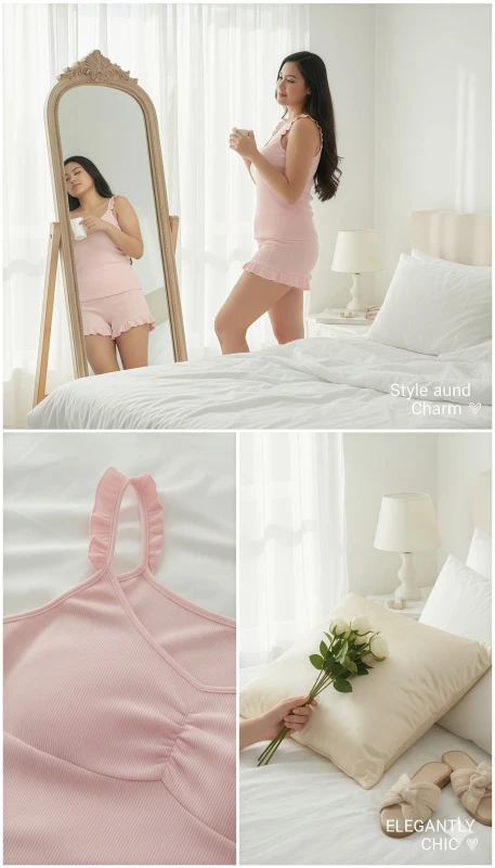 Style/Design: camisole set, short set, ruffled straps, ruffled hem, sweetheart neckline, gathered detail, elastic waist, cute, feminine, stylish, trendy