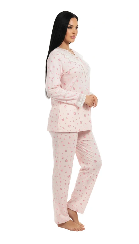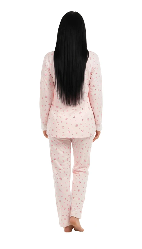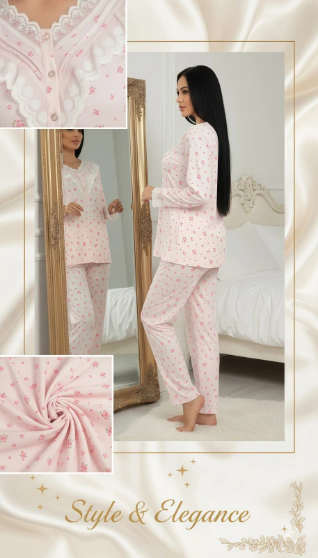 This delightful women's pajama set offers a blend of comfort and feminine charm, perfect for relaxing at home. The soft pink fabric is adorned with an all-over delicate print of tiny pink floral clusters, creating a sweet and gentle aesthetic.