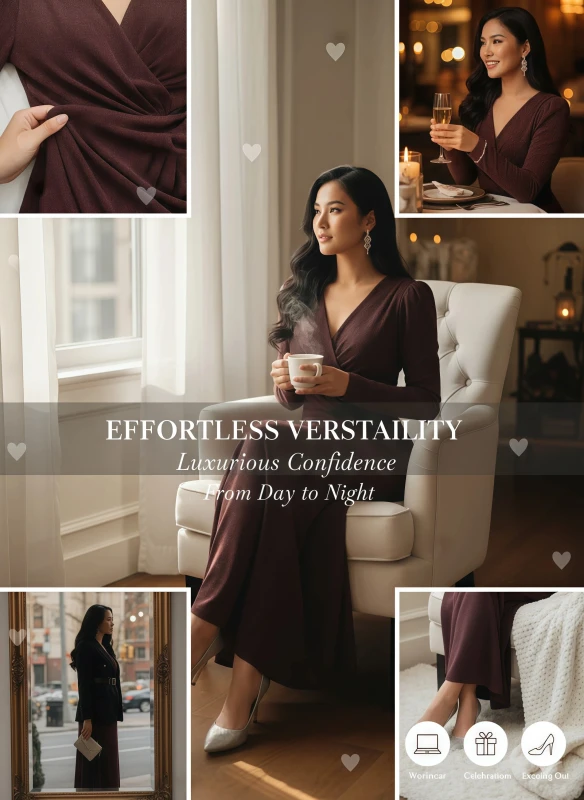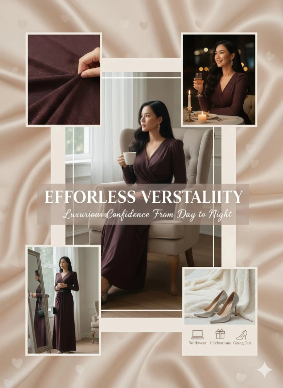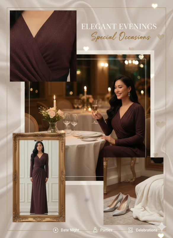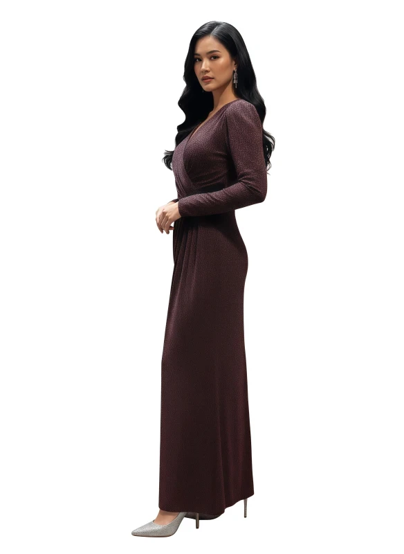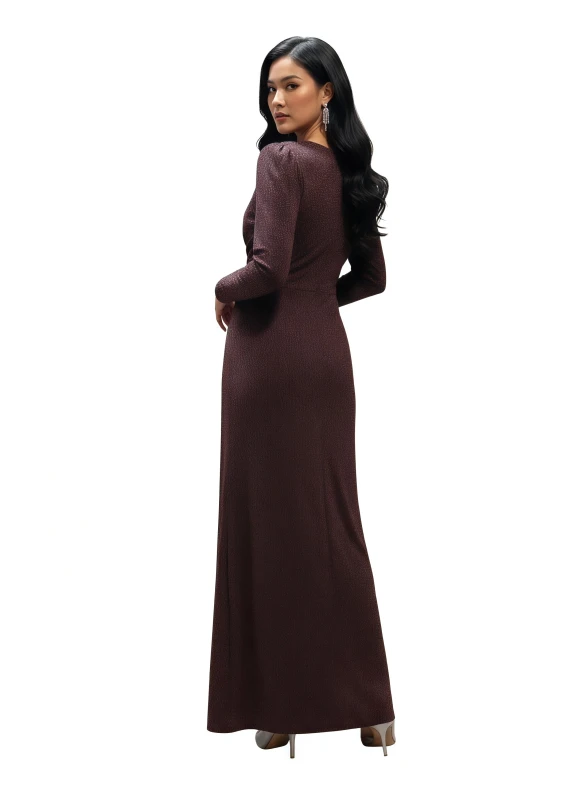 This captivating full-length gown is crafted from a shimmering fabric in a rich plum or burgundy hue, perfect for making a sophisticated statement. It features a flattering V-neckline and long sleeves with subtle shoulder detailing. The highlight of the design is the elegantly twisted and ruched front, which cinches at the waist with a chic black band, creating an hourglass silhouette. The dress flows gracefully to the floor, exuding timeless glamour ideal for formal events, evening parties, or any special occasion.