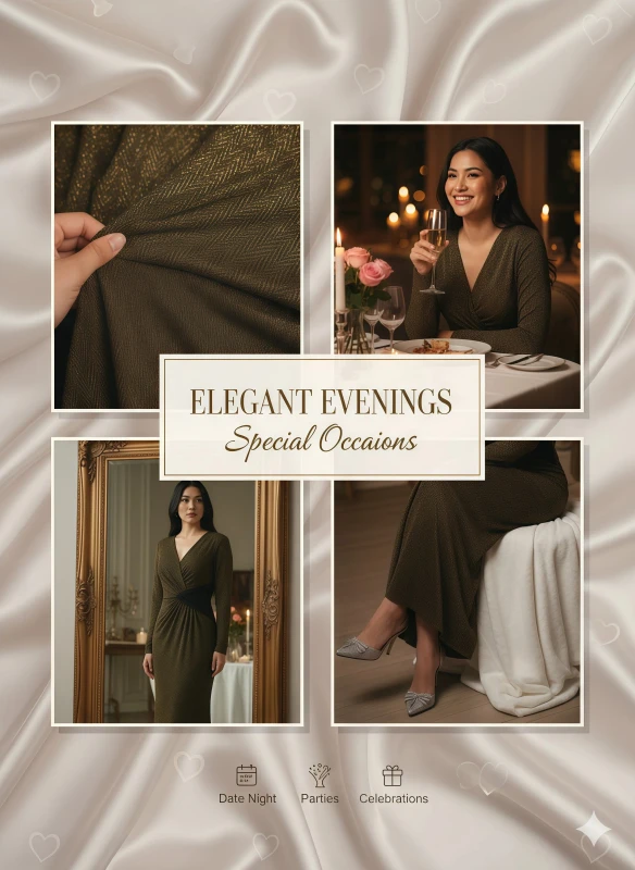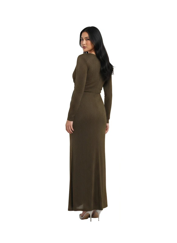Style: Evening gown, formal dress, maxi dress, long dress, V-neck dress, long sleeve dress, ruched dress, twisted front dress, elegant dress, sophisticated dress, party dress, special occasion dress, cocktail dress.