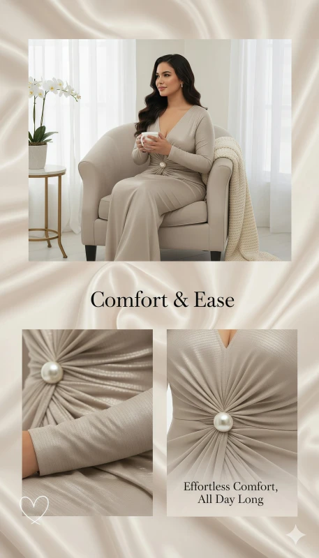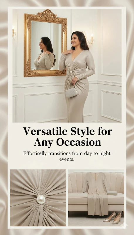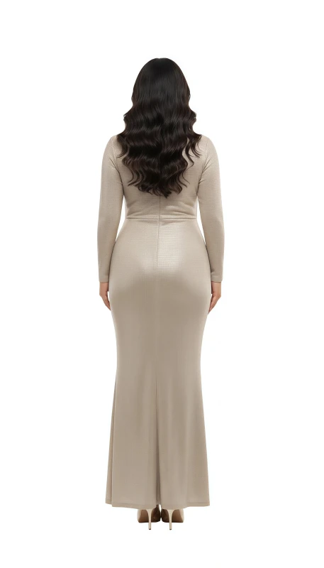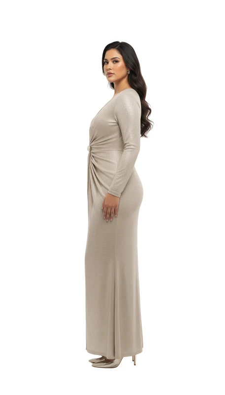 Crafted from a shimmering, lustrous fabric in a rich champagne or light gold hue, this gown effortlessly catches the light, creating an aura of radiant elegance. The flattering V-neckline complements the gown's star feature: a beautifully draped and twisted knot detail at the waist, cinching to create an hourglass silhouette. At the heart of this knot lies a prominent, elegant pearl embellishment, adding a touch of timeless luxury and drawing attention to your figure.