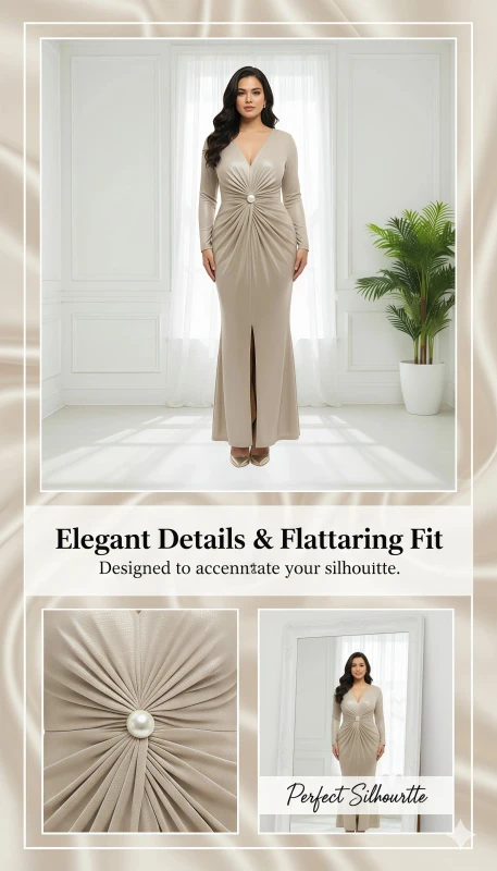 Style/Features: mermaid dress, V-neck dress, long sleeve dress, ruched dress, draped dress, front slit dress, embellished dress, pearl detail dress, sophisticated dress