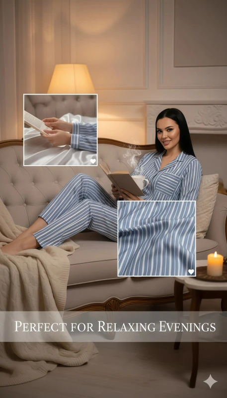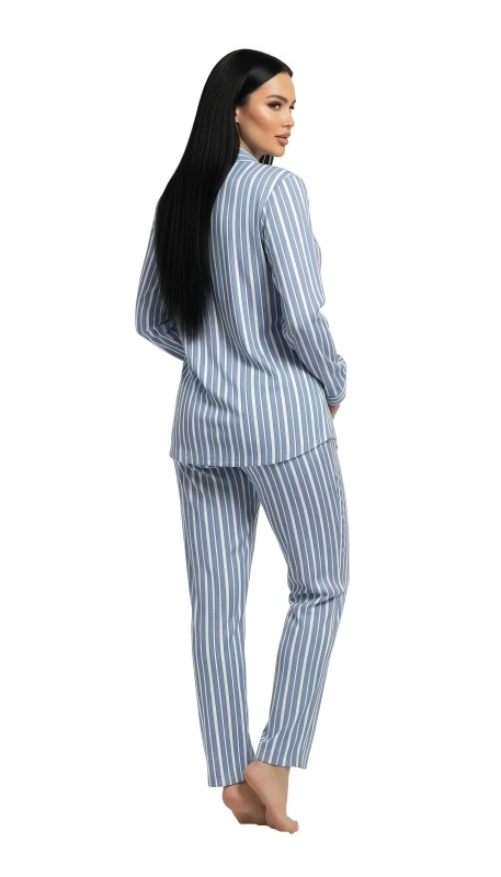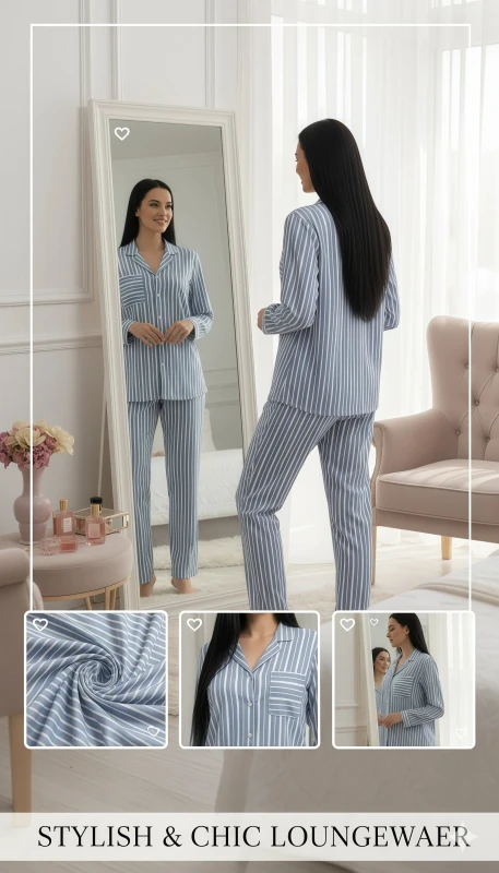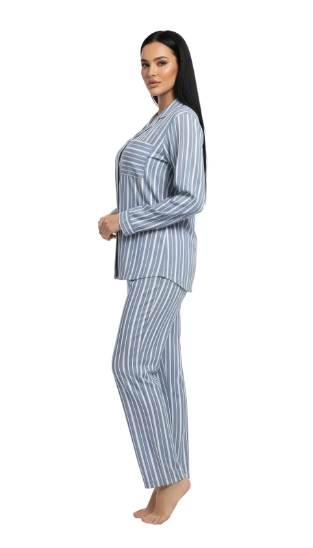 This charming women's pajama set offers a blend of classic style and ultimate comfort, perfect for relaxing evenings and peaceful nights. The two-piece set is crafted from a soft, breathable fabric, adorned with a timeless blue and white vertical stripe pattern that exudes a fresh and sophisticated appeal.
