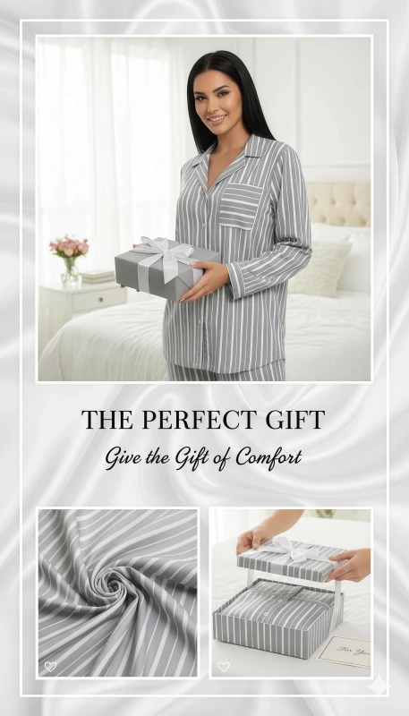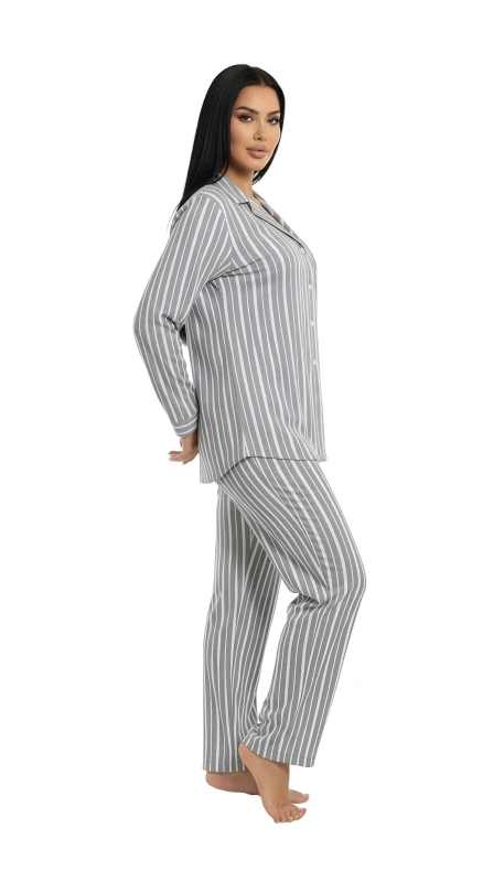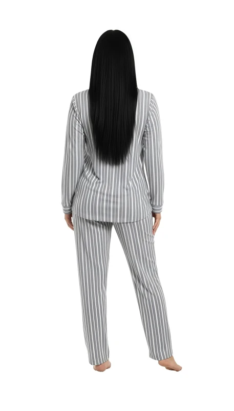 The coordinating pants feature a straight-leg cut that offers a comfortable and flattering fit. An elastic waistband ensures a secure yet gentle feel, adapting comfortably to your body without constriction. The full-length design makes these pajamas suitable for year-round wear. The vertical stripe pattern on the pants elongates the silhouette, contributing to an elegant and relaxed look.
