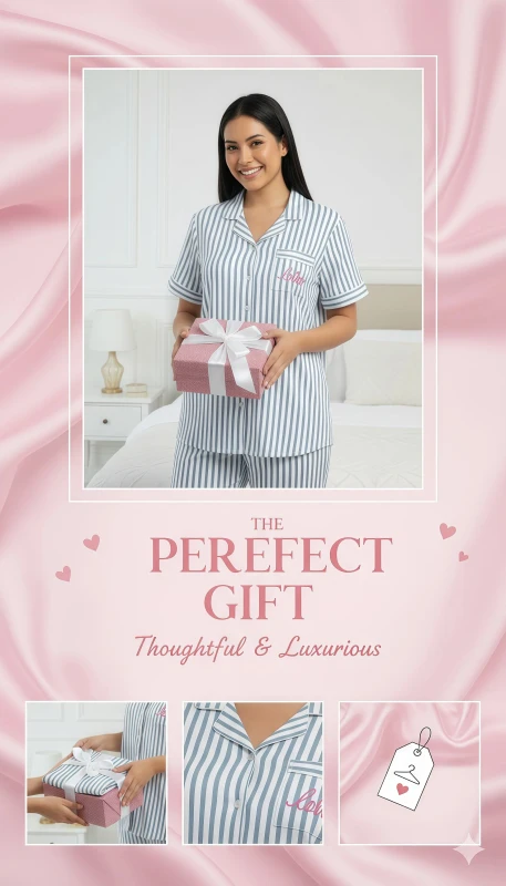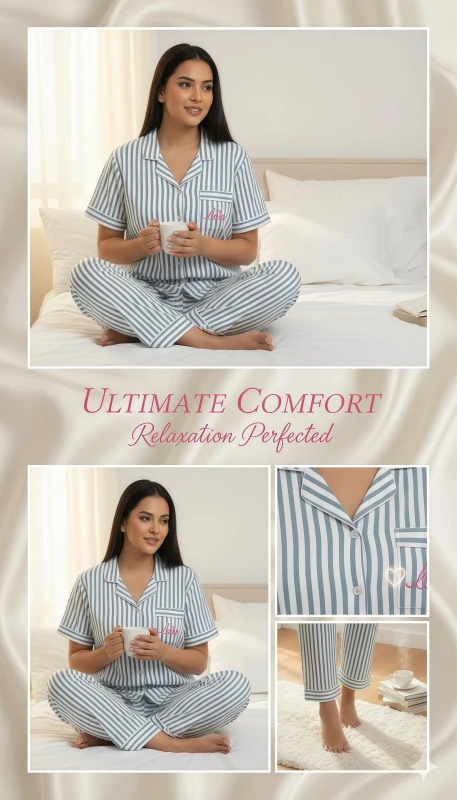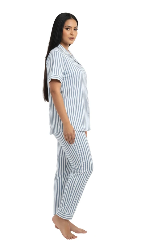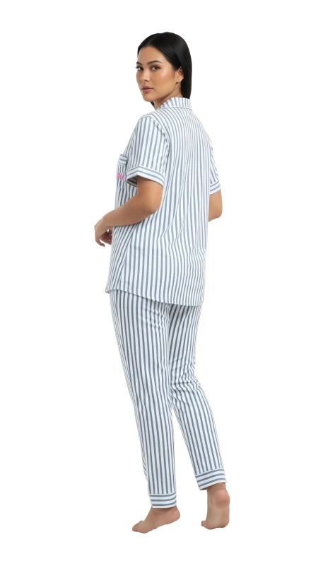 This stylish two-piece set features a crisp pattern of narrow black (or dark grey) and white vertical stripes, offering a timeless and sophisticated look. The short-sleeved top is designed with a traditional notched collar, a full button-front closure, and a playful touch of red embroidery (likely text or a small motif, given the image) on the chest pocket area, adding a hint of personality. The coordinating full-length pants provide a relaxed and comfortable fit, ensuring unrestricted movement and ultimate coziness. Crafted from a soft and breathable fabric, this pajama set is an essential addition to your loungewear collection, offering year-round comfort and elegant style.