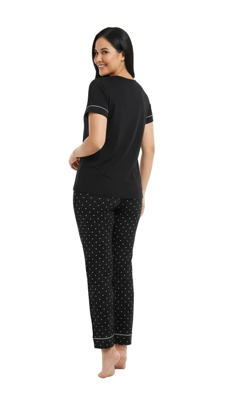 pajama pants with an all-over pattern of tiny white polka dots and piped cuffs.