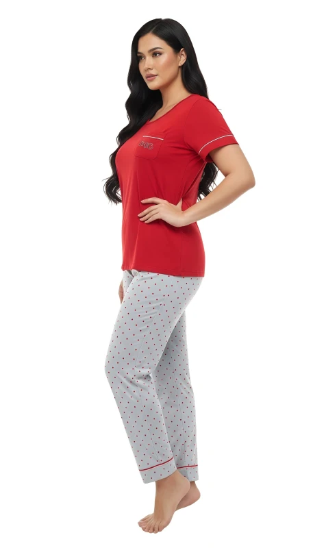 This two-piece sleepwear set features a soft navy blue short-sleeved top and coordinating full-length pants. The top boasts a classic round neckline, subtle white piping along the sleeve cuffs, and a stylish chest pocket with "LOVE" embroidered in vibrant red script, adding a sweet and heartfelt touch. The full-length pajama bottoms are adorned with an all-over pattern of tiny white polka dots, mirroring the delicate accents on the top, and feature a white piped cuff for a cohesive and polished look. Crafted from soft, breathable fabric, this pajama set is designed for ultimate comfort, making it an ideal choice for unwinding after a long day or enjoying a leisurely start to your morning.