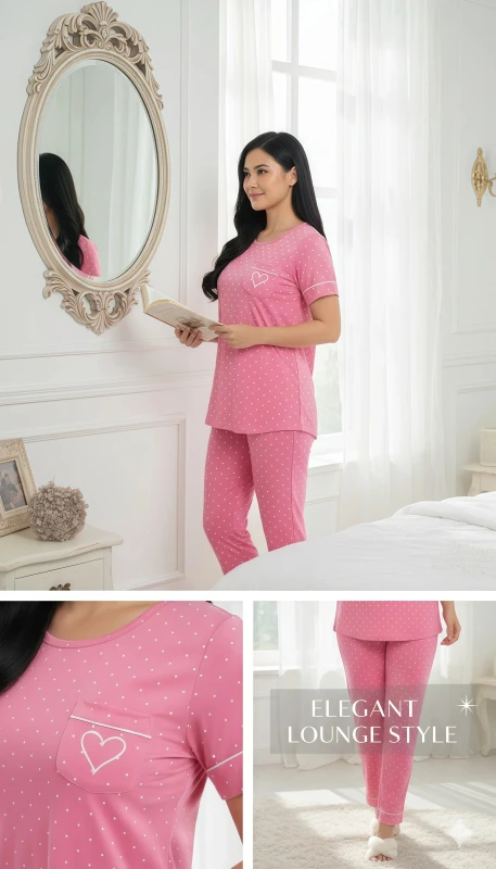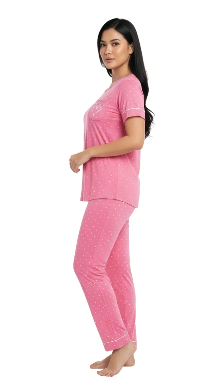 features a soft, vibrant pink short-sleeved top and matching full-length pants,