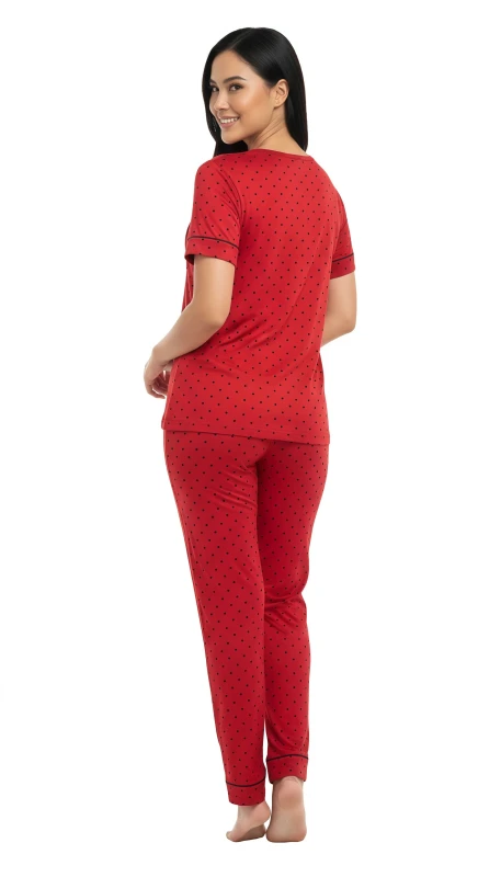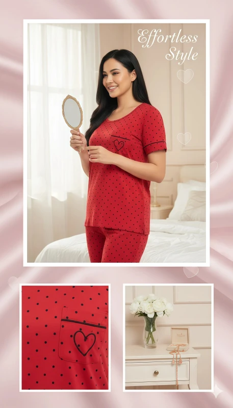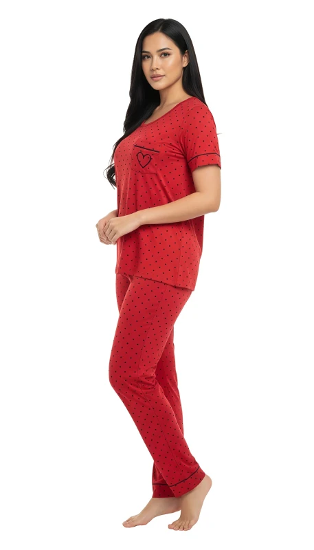 This charming two-piece sleepwear ensemble features a soft, vibrant pink short-sleeved top and matching full-length pants, both adorned with a delightful all-over white polka dot pattern. The top boasts a classic round neckline, subtle white piping along the sleeve cuffs, and a cute chest pocket outlined with a delicate white heart, adding a touch of romance and whimsy. The comfortable full-length pajama bottoms complete the coordinated look, ensuring a snug yet relaxed fit. Crafted from breathable and soft fabric, this pajama set is perfect for a restful night's sleep or a relaxing evening at home, combining playful style with ultimate comfort.