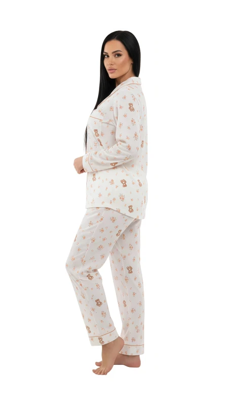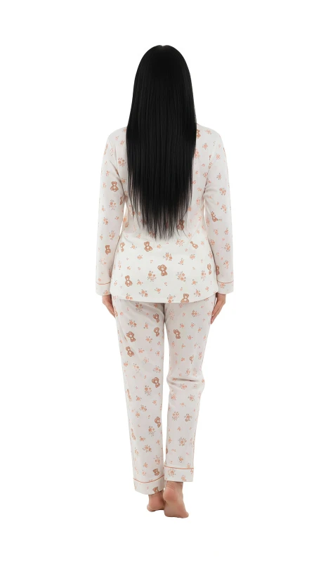 Complementing the top are the matching full-length pajama pants, which carry the same endearing floral and teddy bear pattern. Designed with comfort in mind, they feature a relaxed straight-leg cut and an elasticated waistband, providing a snug yet comfortable fit without being restrictive. The soft, breathable fabric ensures you stay cozy without overheating, promoting a restful night.