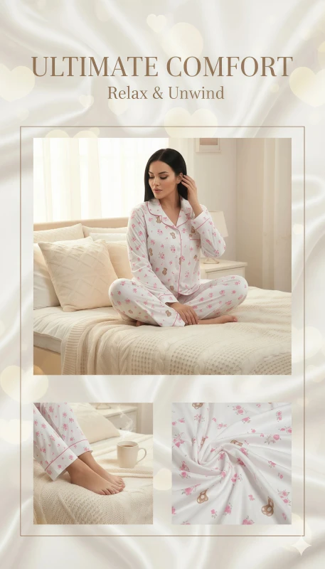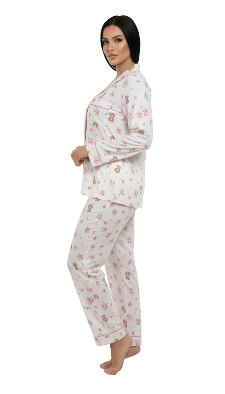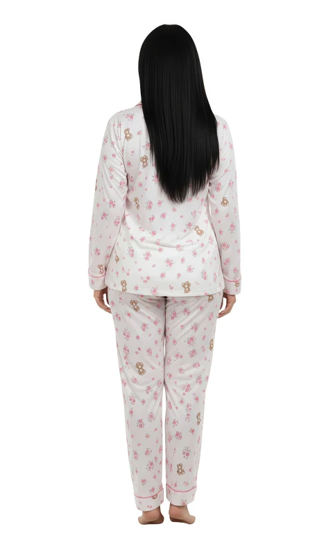 Complementing the top are the matching full-length pajama pants, which carry the same endearing floral and teddy bear pattern. Designed with comfort in mind, they feature a relaxed straight-leg cut and an elasticated waistband, providing a snug yet comfortable fit without being restrictive. The soft, breathable fabric ensures you stay cozy without overheating, promoting a restful night.