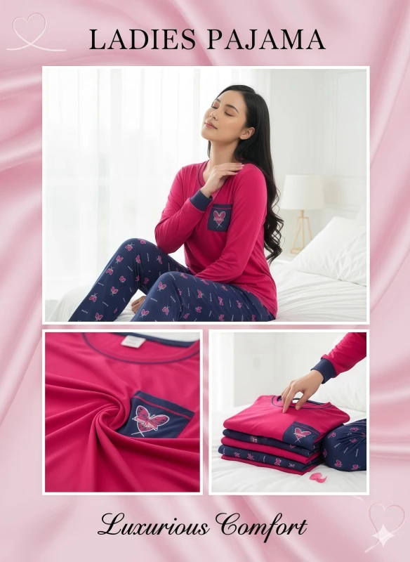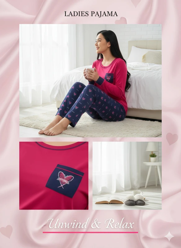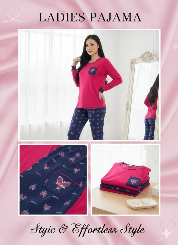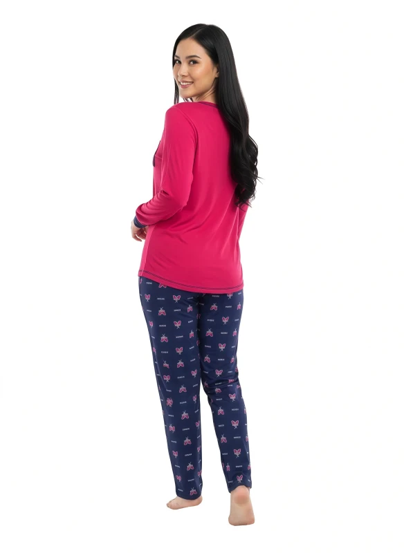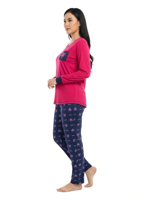 This stylish and comfortable pajama set features a delightful combination of navy blue and vibrant pink, perfect for adding a pop of color to your loungewear collection. The top is a long-sleeved, navy blue shirt with a classic round neckline, accented with subtle pink trim around the collar and cuffs, creating a cohesive look. A unique square patch pocket in a contrasting pink fabric, detailed with a delicate butterfly design, is prominently placed on the left side of the chest, adding a playful and distinctive touch.