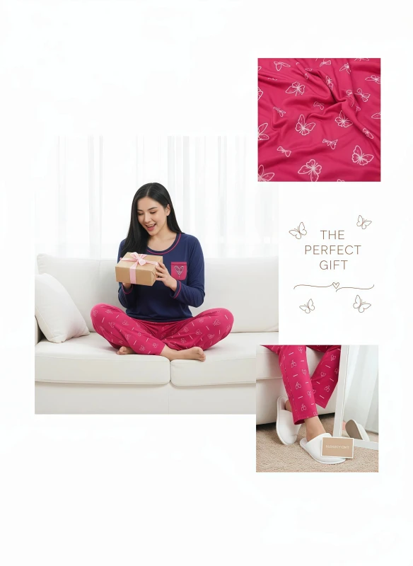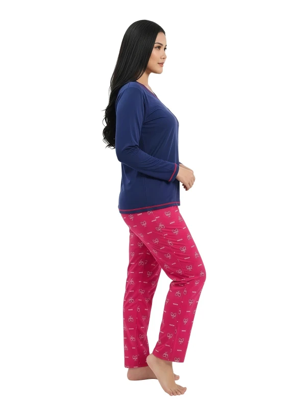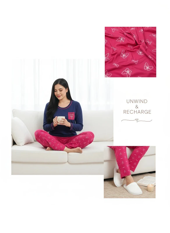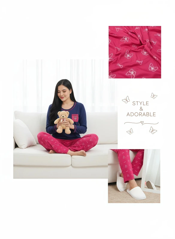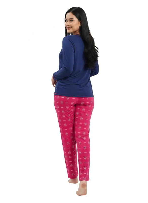 This stylish and comfortable pajama set features a delightful combination of navy blue and vibrant pink, perfect for adding a pop of color to your loungewear collection. The top is a long-sleeved, navy blue shirt with a classic round neckline, accented with subtle pink trim around the collar and cuffs, creating a cohesive look. A unique square patch pocket in a contrasting pink fabric, detailed with a delicate butterfly design, is prominently placed on the left side of the chest, adding a playful and distinctive touch.