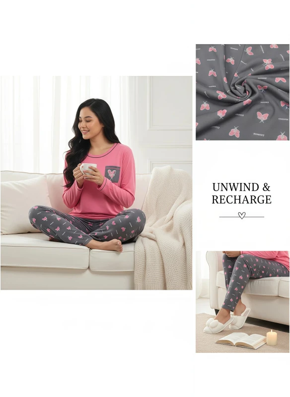 The matching full-length pajama pants are a cheerful hot pink, adorned with an all-over pattern of white or light-colored butterflies, harmonizing with the pocket detail on the top. The pants likely feature an elastic waistband for a comfortable and adjustable fit, ensuring ease of movement whether you're relaxing at home or drifting off to sleep.