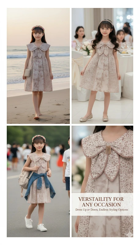The flattering A-line silhouette ensures comfort and freedom of movement, perfect for active girls. Gentle pleats cascade from the waist, adding a graceful flow to every step. Finished with delicate trim accentuating the collar and waistline, this dress is ideal for special occasions, family gatherings, or simply making everyday moments a little more magical. Easy to wear and effortlessly stylish, it's a dress she'll love to twirl in.