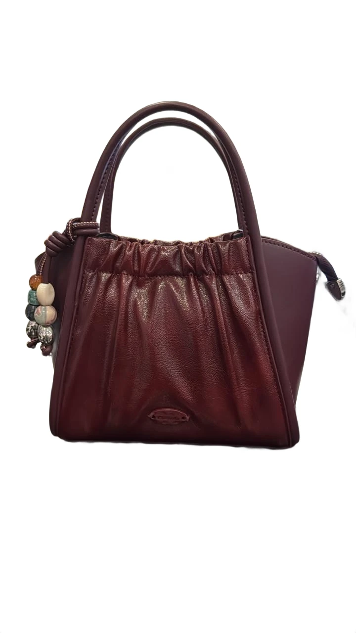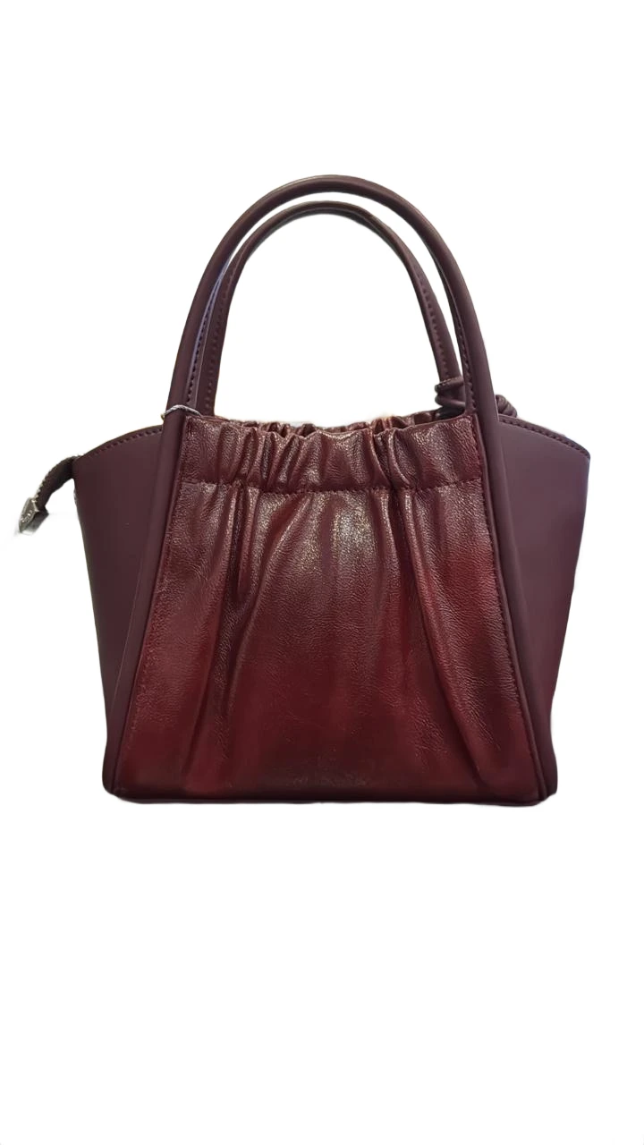 This eye-catching handbag features a rich, deep Merlot (or burgundy/plum) hue crafted from high-quality material, distinguishing it with its unique design. The front panel boasts artfully gathered or "ruched" detailing, creating a soft, textural contrast that adds a touch of feminine allure.
