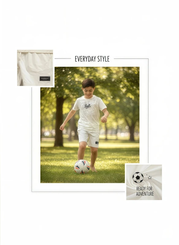 Unleash a playful vibe with our "Dot Dash" Casual Set, perfect for the energetic young boy. This eye-catching two-piece outfit features a comfortable off-white short-sleeve t-shirt adorned with a bold "Ball" logo and an intricate all-over speckled dot and dash graphic print. The matching shorts echo this unique pattern, complete with a contrasting white drawstring waist for a secure and adjustable fit. Crafted from soft, breathable fabric, this monochrome set offers both standout style and all-day comfort, making it ideal for playground adventures, summer fun, or simply expressing his cool personality.