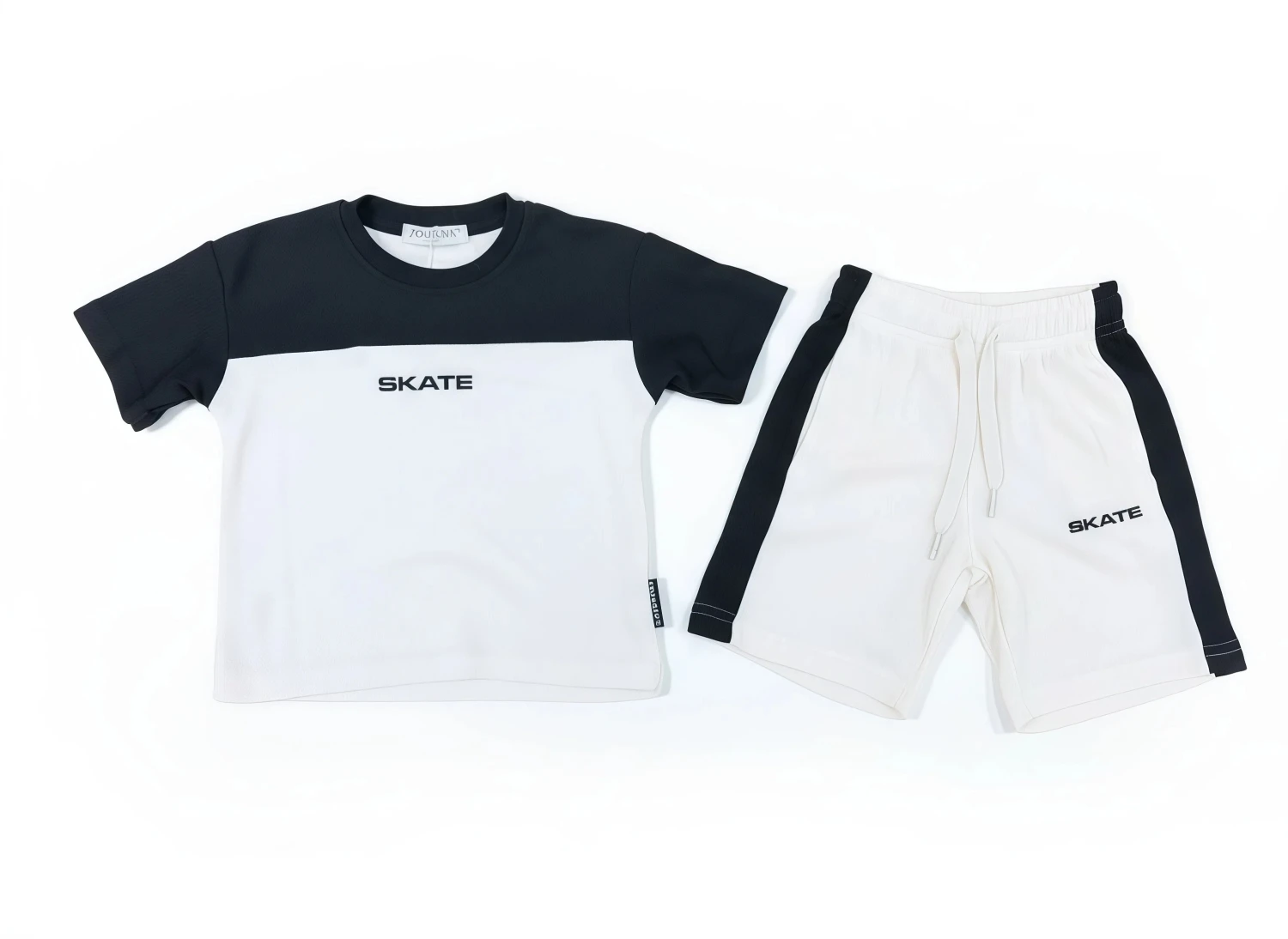 "SKATE" detail and cool black side stripes, this outfit is designed
