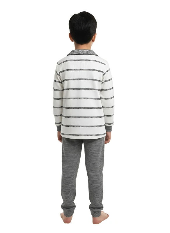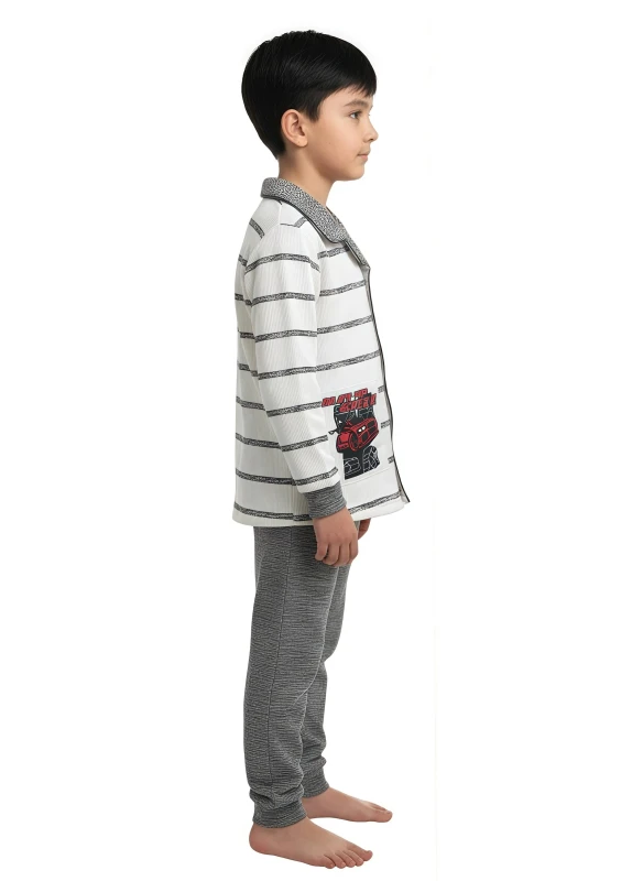 This stylish and comfortable boy's pajama set combines playful details with classic comfort, perfect for bedtime adventures. The long-sleeved top features a charming white base with bold blue horizontal stripes, giving it a nautical or sporty vibe. Adding a fun touch, the top includes an embroidered "DREAM Big" slogan near the collar and a cool patch graphic of a red race car with "MY OWN SPEED" lettering on the chest pocket. The solid blue collar and button placket provide a nice contrast, while the matching solid blue full-length pants complete the coordinated look.