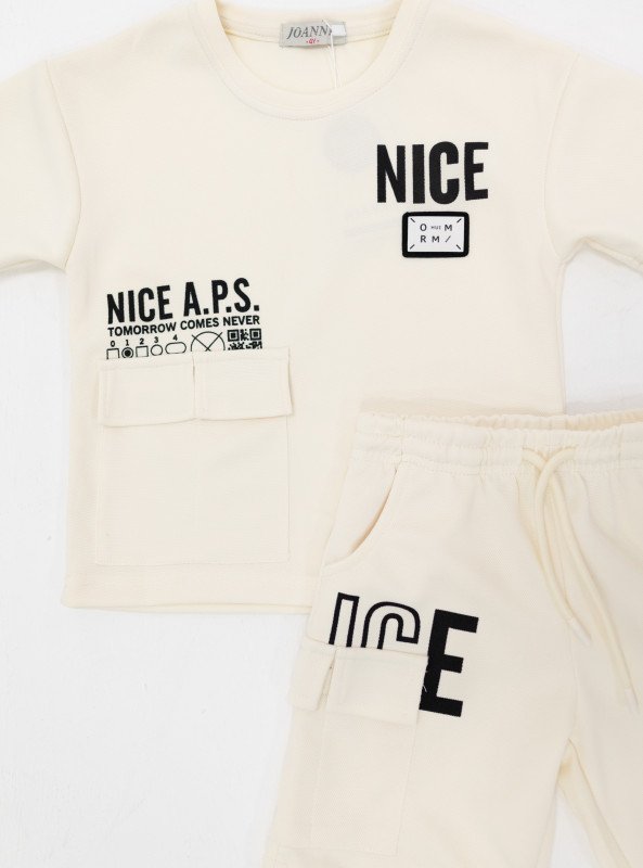 Add bold style to your boy's everyday wardrobe with this trendy two-piece set. Featuring a soft, breathable t-shirt paired with comfy drawstring shorts, this set is perfect for active days or casual outings. The modern street-style graphics, utility-inspired pockets, and bold lettering like "NICE A.P.S." and "TOMORROW COMES NEVER" bring a cool, urban edge.