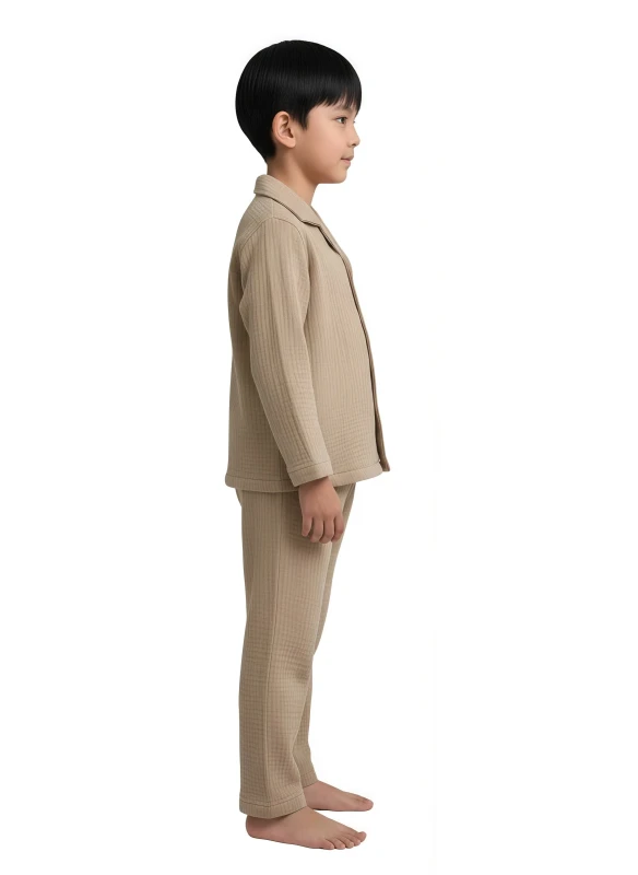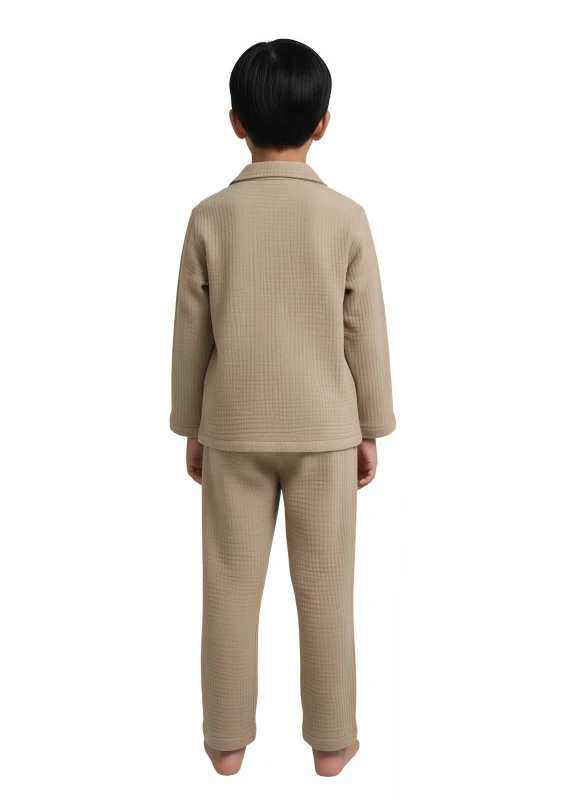 This charming boy's pajama set offers a blend of comfort and natural style, perfect for sweet dreams and relaxed mornings. The set includes a long-sleeved button-up top and matching full-length pants, both in a soft, breathable natural beige fabric with a subtly textured, possibly quilted or seersucker-like, finish. The top features a classic collar and a single chest pocket, while the overall minimalist design emphasizes comfort and understated elegance.