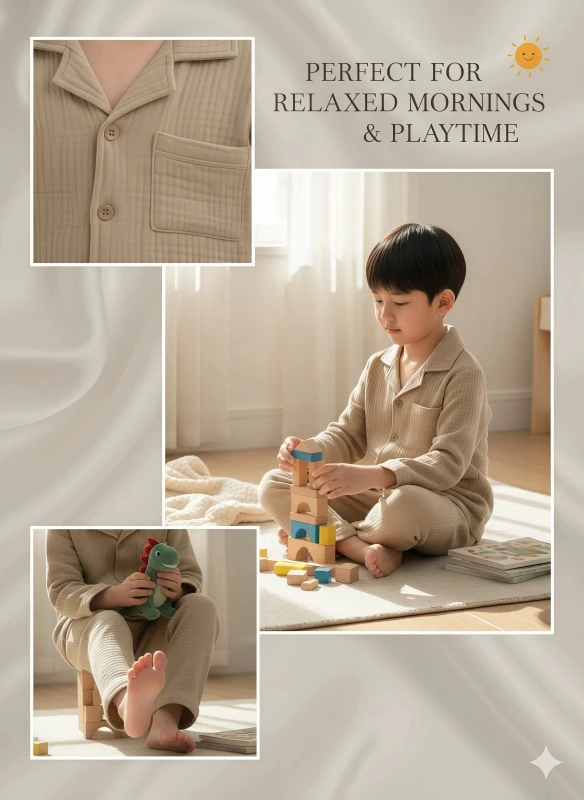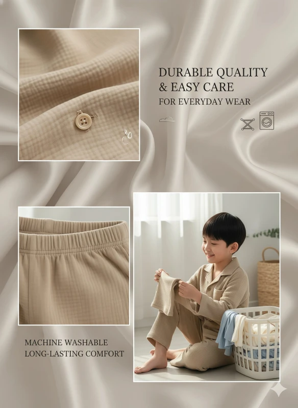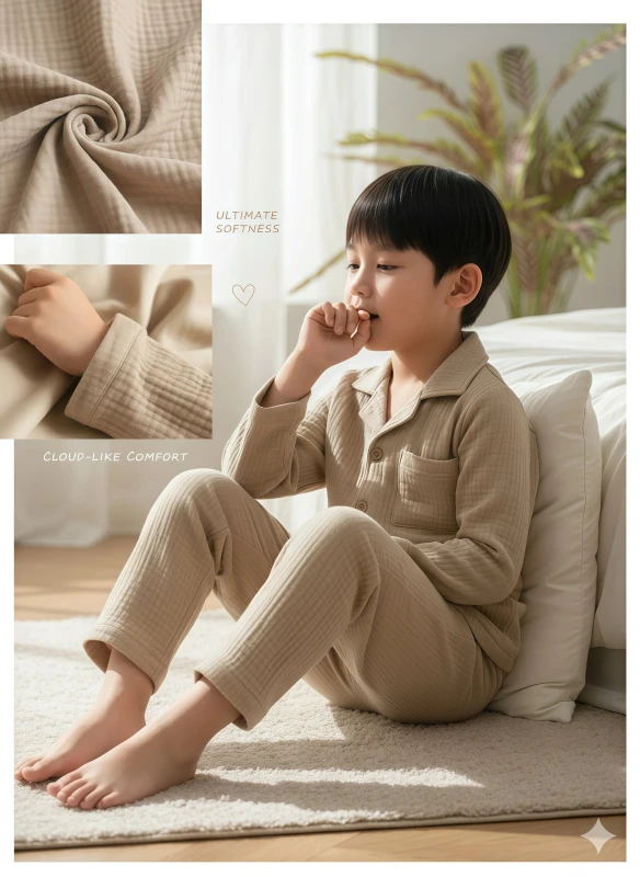 Keywords: boy's pajamas, kids sleepwear, natural beige pajamas, textured pajamas, quilted pajamas, seersucker pajamas, crinkled cotton pajamas, comfortable pajamas, long-sleeve pajamas, button-up pajamas, children's nightwear, cozy pajamas, minimalist pajamas, boys fashion, sleep set, loungewear, breathable fabric.