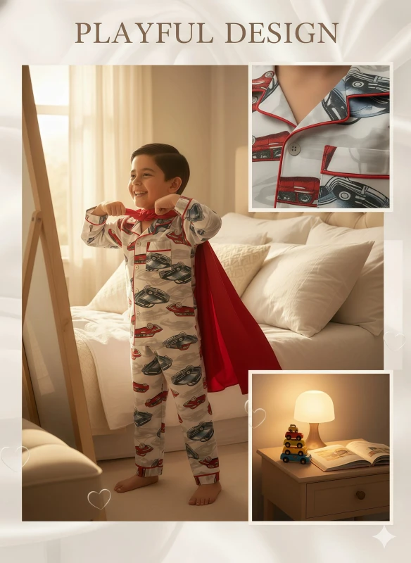 Keywords: boy's pajamas, kids sleepwear, car print pajamas, vintage car pajamas, comfortable pajamas, long-sleeve pajamas, button-up pajamas, children's nightwear, cozy pajamas, red piping, boys fashion, sleep set, loungewear, playful design, car enthusiast.