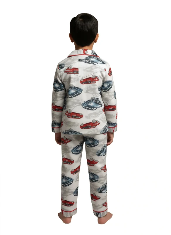 This fun and comfortable boy's pajama set will have your little one racing to bed! The set features a lively print of vintage-style cars in shades of red and blue, set against a light grey background, bringing a playful touch to bedtime. The long-sleeved button-up top and matching full-length pants are both accented with vibrant red piping along the collar, placket, cuffs, and hem, adding a classic pajama detail. Made for cozy comfort, these pajamas are perfect for any young car enthusiast.