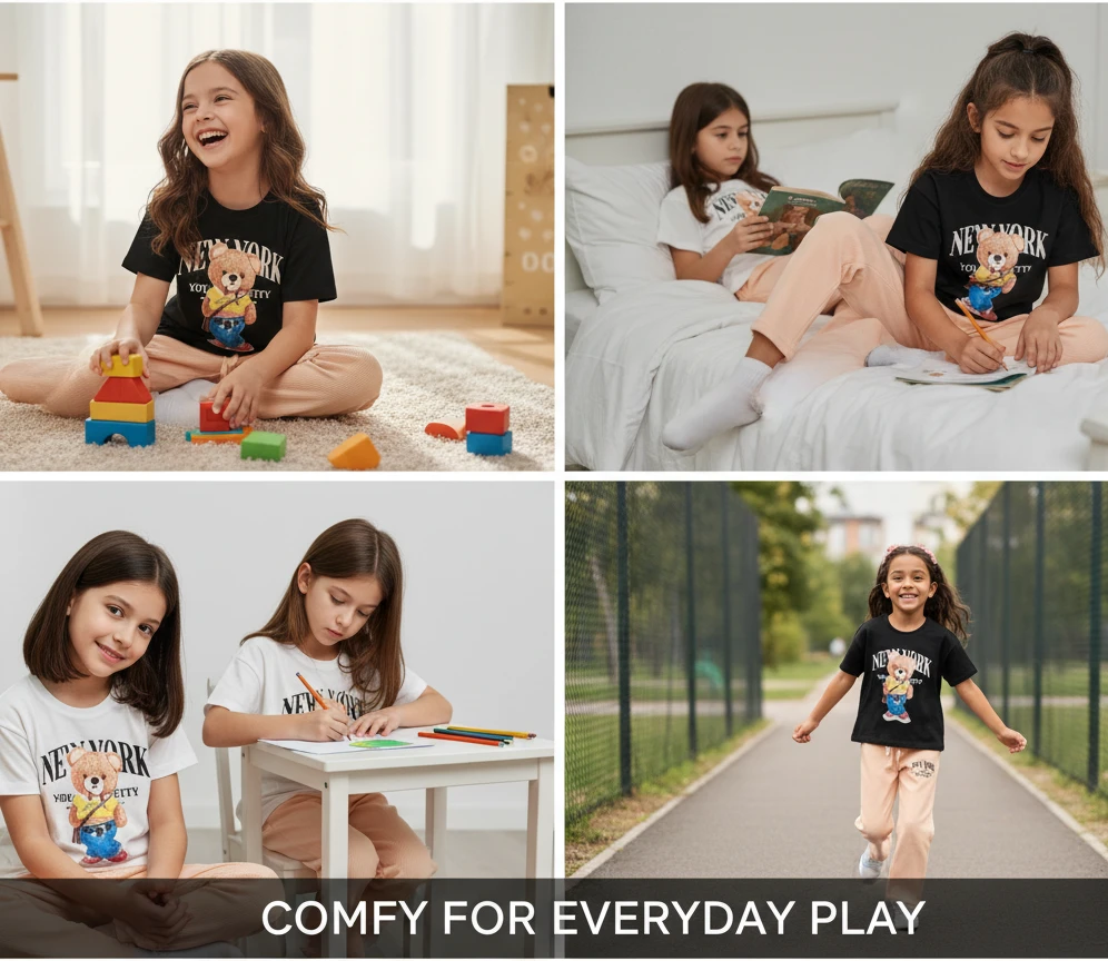 Let her express her playful side with this adorable and comfortable casual set! Featuring a charming black t-shirt adorned with a cute, denim-clad bear graphic and bold "New York" lettering, this outfit is designed for both style and ease. The soft, breathable fabric ensures all-day comfort, whether she's out and about or relaxing at home.
