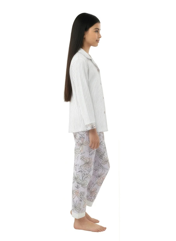 Complementing the top are the pajama bottoms, which showcase a beautiful and enchanting butterfly and floral pattern against a soft, light-colored background. The design is artistic and flowing, with various butterflies and blossoms scattered gracefully across the fabric, creating a serene and dreamlike aesthetic. The elastic waistband provides a comfortable and secure fit without being restrictive, while the full-length cut offers warmth and coverage. The fabric chosen for both pieces appears to be soft to the touch, likely a blend that prioritizes comfort and durability, making these pajamas ideal for extended wear. The overall aesthetic is one of youthful charm and cozy elegance, perfect for anyone who appreciates comfort without sacrificing style in their loungewear.