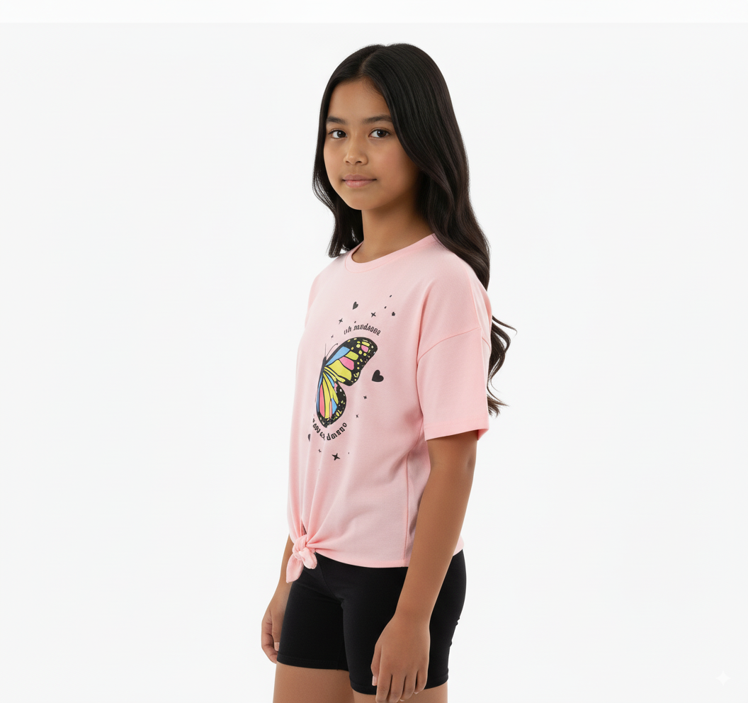 and butterfly design adds a chic element to these girls' T-shirts. The round