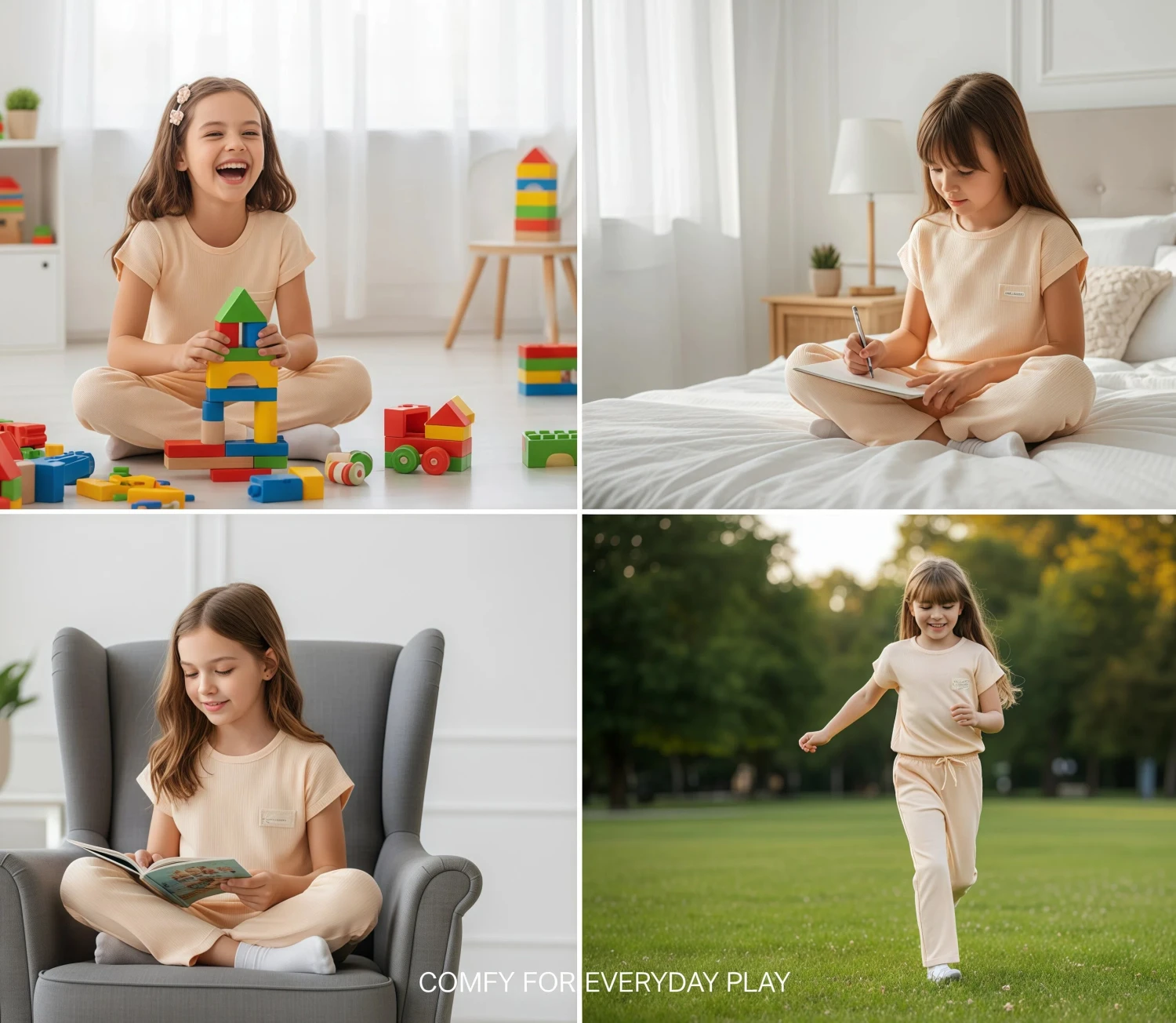 Girls' casual set, lounge set, ribbed t-shirt, drawstring pants, girls' comfortable outfit, stylish loungewear, kids fashion, girls' two-piece set, casual everyday wear, relaxed fit, soft fabric, versatile outfit, girls' sleepwear, blue outfit for girls, summer loungewear, spring outfit for girls.