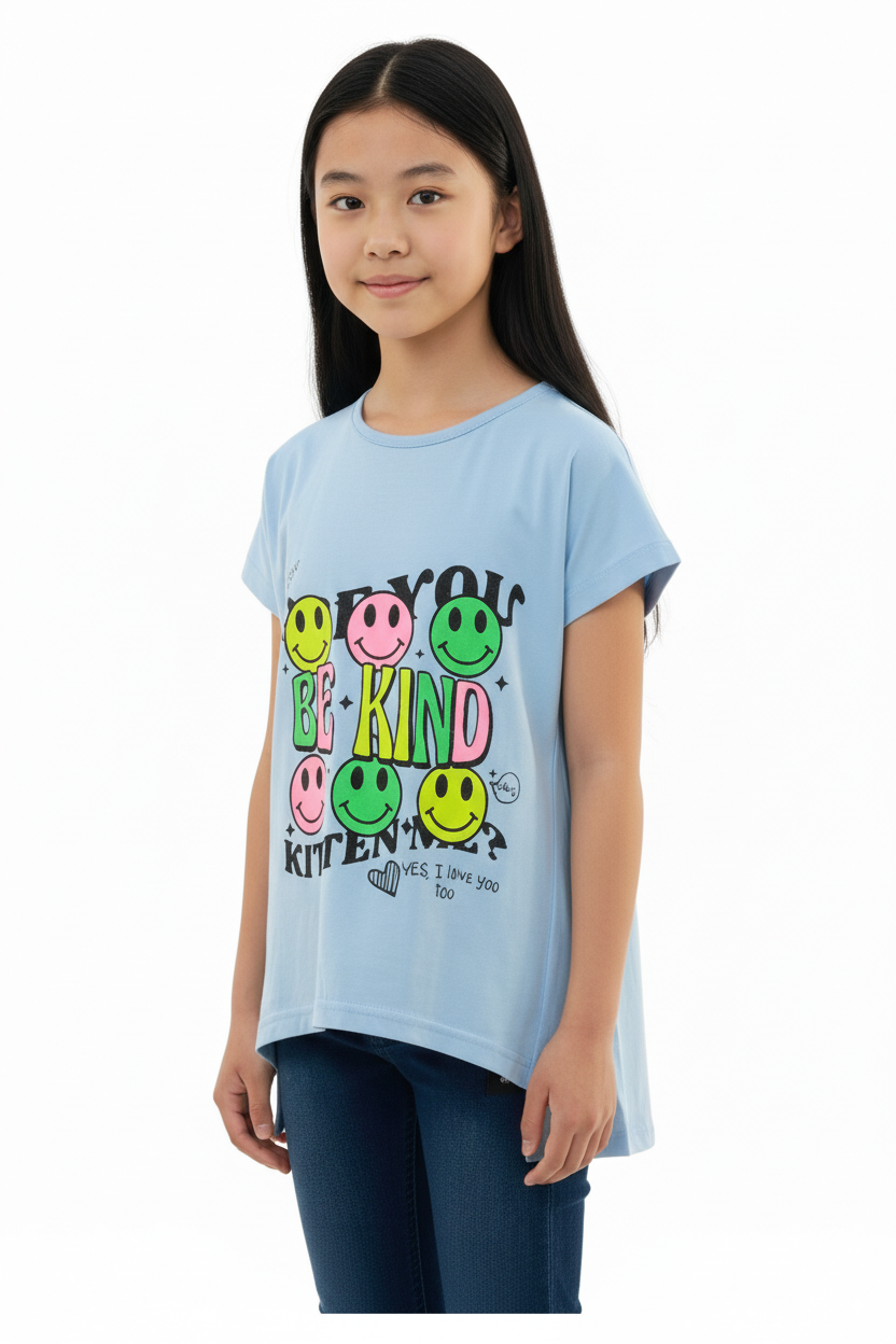 Girl's Smiley with Be Kind Print Round Neck Long Back Short Sleeve T-Shirt - Blue