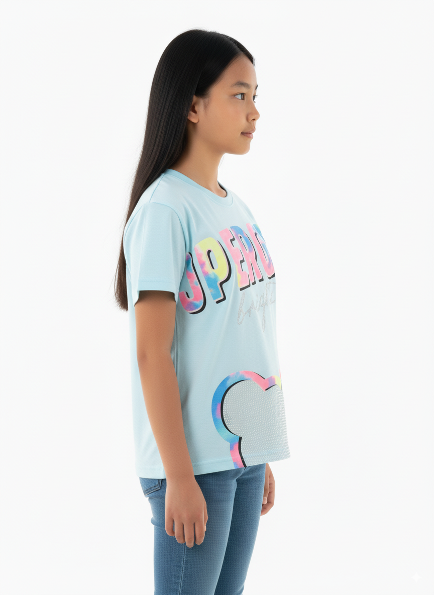 Girl's Super Girl Brighter Print Round Neck Short Sleeve T-Shirt - SkyBlue
