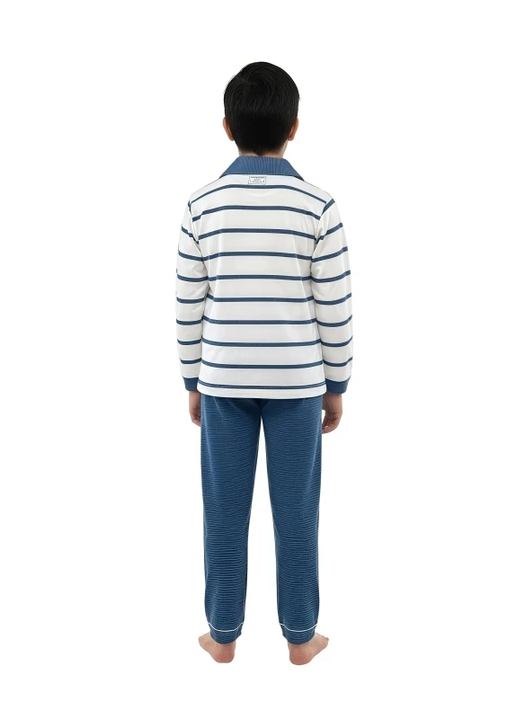 This charming and comfortable boy's pajama set combines a playful design with cozy features for a perfect night's sleep. The long-sleeved top showcases classic white and blue horizontal stripes, creating a fresh and timeless look. Adding a touch of whimsy, it features a delightful graphic of a peeking panda bear and the inspiring phrase "DREAM BIG." The top is designed with a classic notched collar and a partial button placket for easy wear. Complementing the top are solid blue full-length pants, ensuring a coordinated and snug ensemble. Crafted from soft, breathable fabric, these pajamas are ideal for lounging and dreaming big.