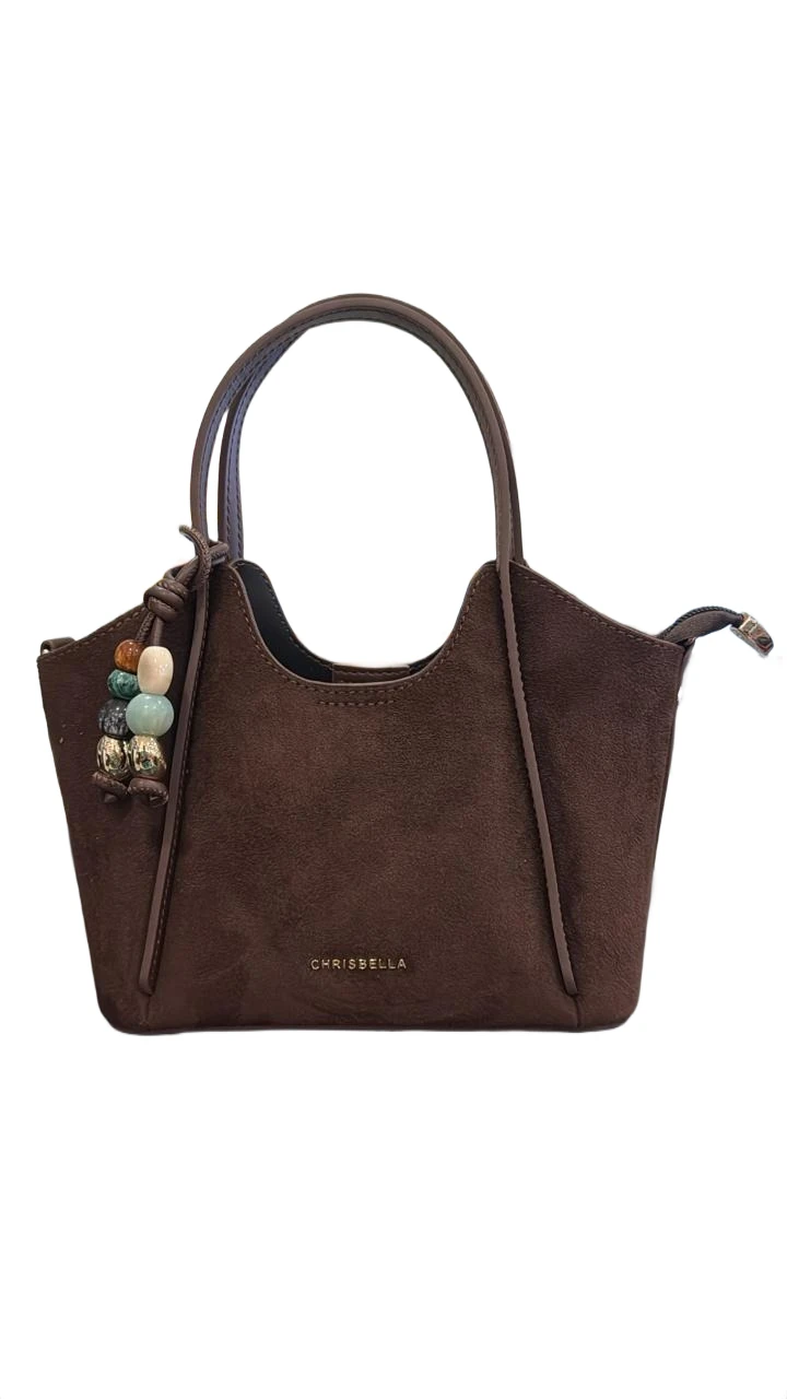 Inside, you'll find ample space for your belongings, while the included matching mini pouch keeps your smaller items organized and easily accessible. Whether carried by hand for a chic look or worn over the shoulder with the detachable, adjustable strap for hands-free convenience, this Chrisbella set seamlessly adapts to your busy lifestyle. From a casual brunch to an evening out, the "Suede Ember" set is designed to complement any ensemble with effortless elegance.