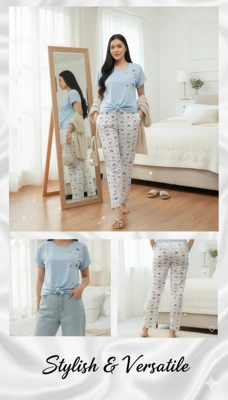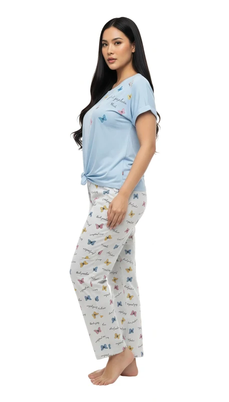 This two-piece sleepwear ensemble is designed for those who love a touch of whimsical style in their loungewear. The light blue short-sleeve top features a round neck and an adorable scatter of pastel butterflies, with a trendy tied knot detail at the front hem for a relaxed, fashionable look. Complementing the top are the soft, full-length pants, adorned with an enchanting all-over print of colorful bows and subtle script. Crafted from a soft, breathable fabric, this set promises a comfortable and sweet escape, perfect for relaxing at home or drifting off to sleep in style.