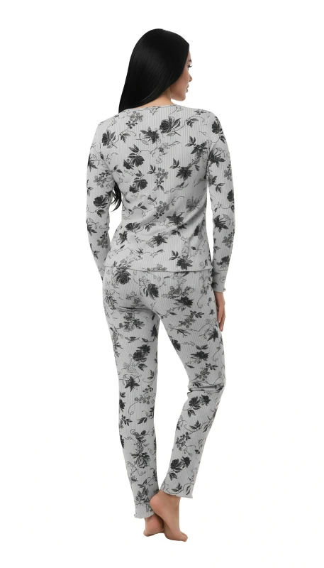 Complementing the top are the coordinating long pajama pants, designed with a relaxed fit for unrestricted movement and ultimate comfort. The matching floral pattern flows seamlessly, creating a cohesive and beautifully coordinated look. The elasticized waist ensures a snug yet comfortable fit, allowing you to move freely whether you're unwinding on the sofa, enjoying a good book, or getting ready for bed.