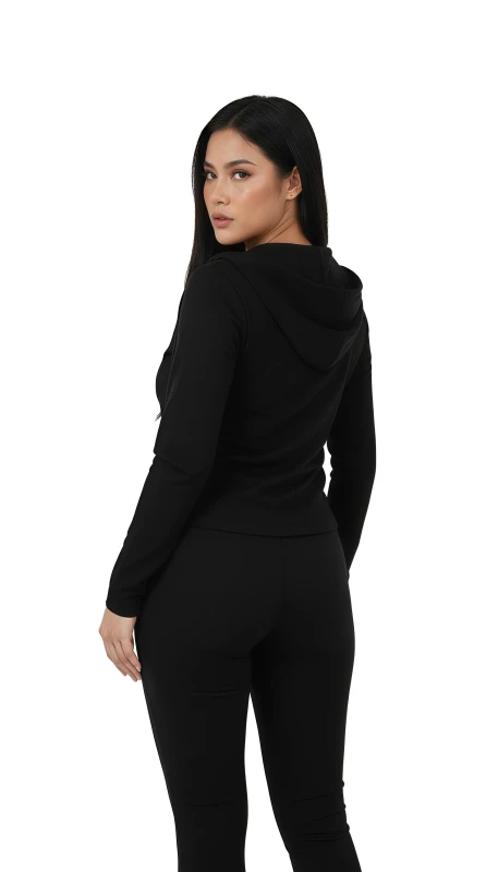 Designed with a flattering, slightly tailored fit, this hoodie subtly accentuates the silhouette without feeling restrictive. The long sleeves provide ample coverage, while the ribbed cuffs and hem ensure a snug yet comfortable fit that helps to retain warmth. It's a garment that combines both form and function, making it suitable for a variety of activities – whether you're heading to the gym, running errands, or simply relaxing at home.