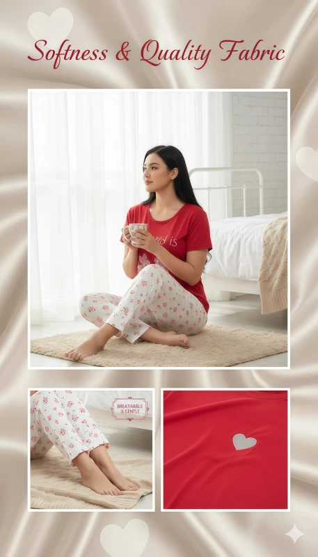 This two-piece sleepwear set features a vibrant red short-sleeved top adorned with an adorable graphic of two cuddly bunnies nestled within a heart, accompanied by the tender message "All you need is Only" (presumably "Love" as the last word, though not fully visible). The round-neck top offers a relaxed and comfortable fit. Complementing the top are the lovely full-length pajama bottoms, showcasing a delicate all-over floral print with small pink and red blossoms and green leaves on a pristine white background. Crafted from soft, breathable fabric, this pajama set combines heartfelt cuteness with timeless floral elegance, making it perfect for unwinding in style and comfort.