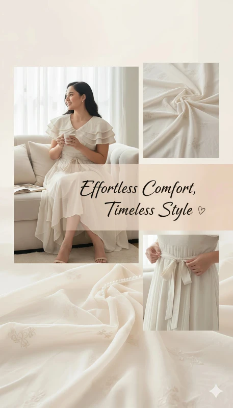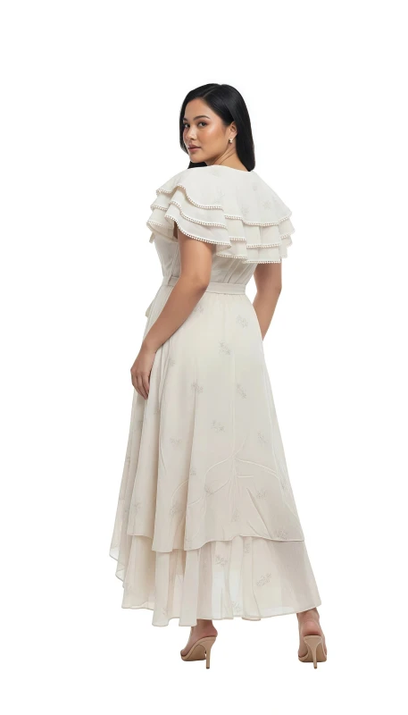 The standout tiered ruffle collar, embellished with lustrous pearls, beautifully frames the neckline, adding a touch of sophisticated whimsy. Complemented by charming ruffled cap sleeves, this dress creates a soft, feminine silhouette. A matching tie-waist sash cinches gracefully, accentuating your figure while offering an adjustable and comfortable fit.
