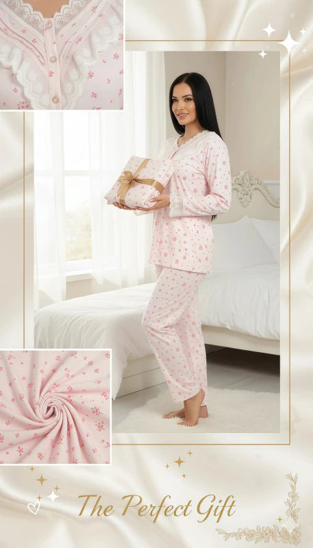 The coordinating full-length pajama bottoms feature the same charming pink floral print and a comfortable, relaxed fit. This pajama set is an ideal choice for those who appreciate soft colors, delicate details, and a cozy yet elegant feel in their loungewear.