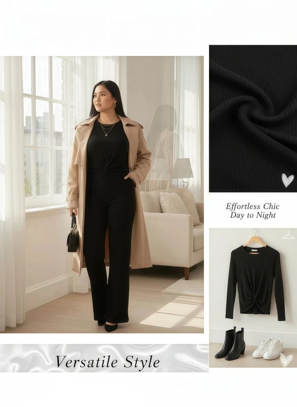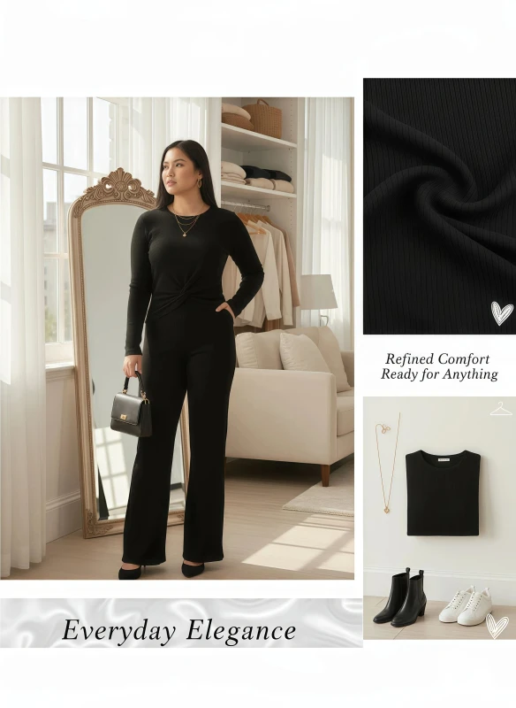 Women's Rust Ribbed Knit Twist Front Top & Wide Leg Pant Set - Black