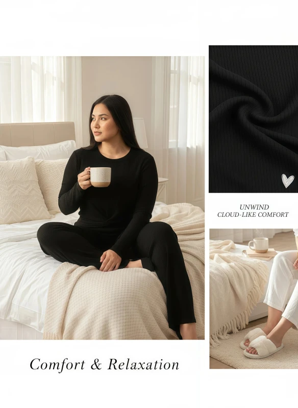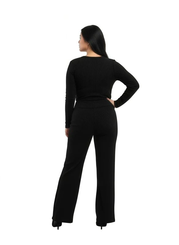 The coordinating wide-leg pants boast a relaxed fit that drapes beautifully, offering ease of movement and a contemporary aesthetic. The ribbed texture throughout the set adds visual interest and a subtle dimension to the overall look. Crafted from a soft and stretchy knit fabric, this ensemble promises all-day comfort without compromising on style.